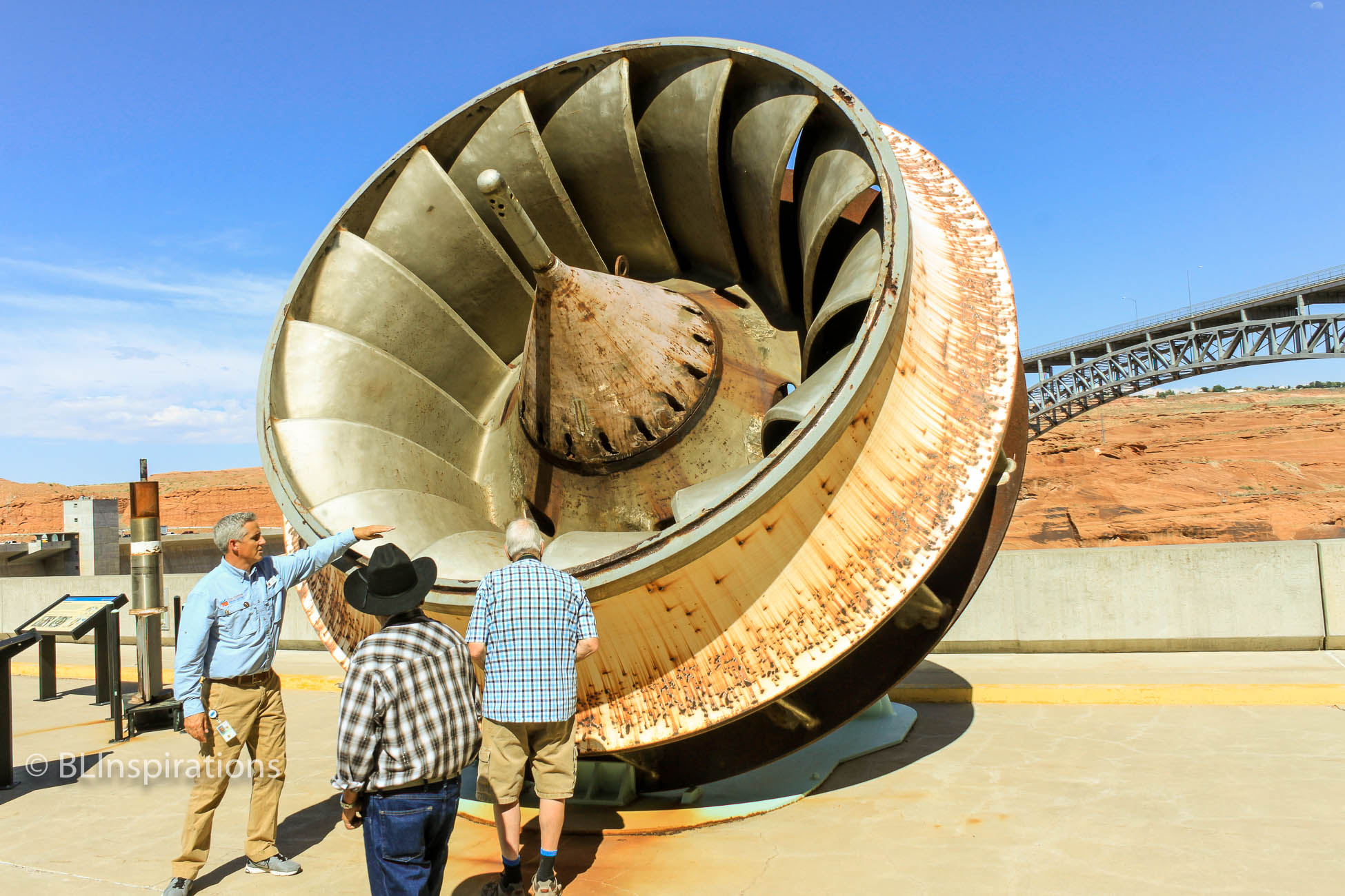 Our visit included a tour of the dam and power plant. There were several displays on the top of the dam related to the dam’s power generation, including a turbine impeller which had been used to turn a generator, and a penstock valve used to control the flow of water into a turbine. The Carl B. Hayden Visitor Center is located 700 feet above the Colorado River overlooking Glen Canyon Dam and Bridge but we didn’t visit it.