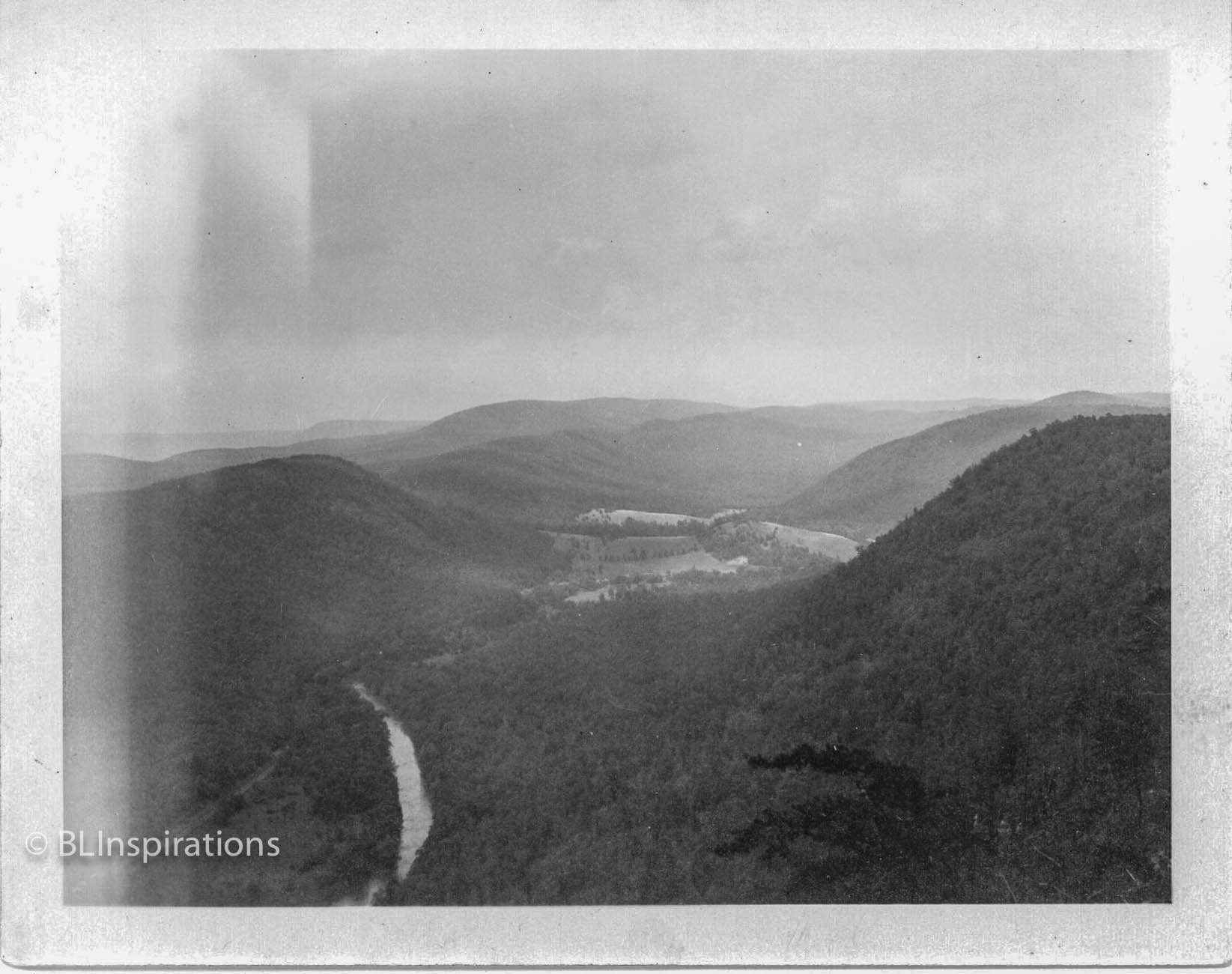 Penn’s View Overlook is a 50 yard clearing on the summit of Poe Mountain in Bald Eagle State Forest, above Penns Valley and Penns Creek, in Poe Paddy State Park. The overlook is about 1000 feet above the valley below. The view is northerly and encompasses about 135˚. Some of the town of Coburn is visible through Penns Valley just to the left of the center of the photo. Penns Creek flows through that valley and then makes several loops which can be partially seen from left to right across the photo. The photo my father took captures only the last leg flowing away (to the northeast) at the right side of my photo. In his photo, there are more mountains visible to the right, which are now blocked by trees.